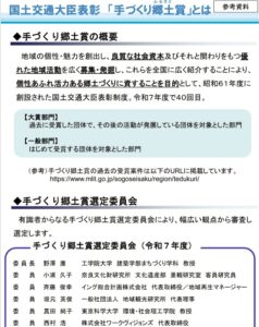令和7年度手づくり郷土賞(国土交通大臣表彰)認定されました! 2025年12月16日 最終更新日時 : 2025年12月16日 admin 実施日: 2025年12月16日(火)活動内容 初めての応募でしたが、見事に受賞になりました! 1〜2月に表彰授与式、令和8年3月1日に東京での発表会に臨みます。 ベストプレゼン賞も併せていただけるよう、頑張りたいと思います 令和7年度手づくり郷土賞(国土交通大臣表彰)10件を認定! 活動写真関連SNS投稿Facebook投稿を確認Instagram投稿を確認